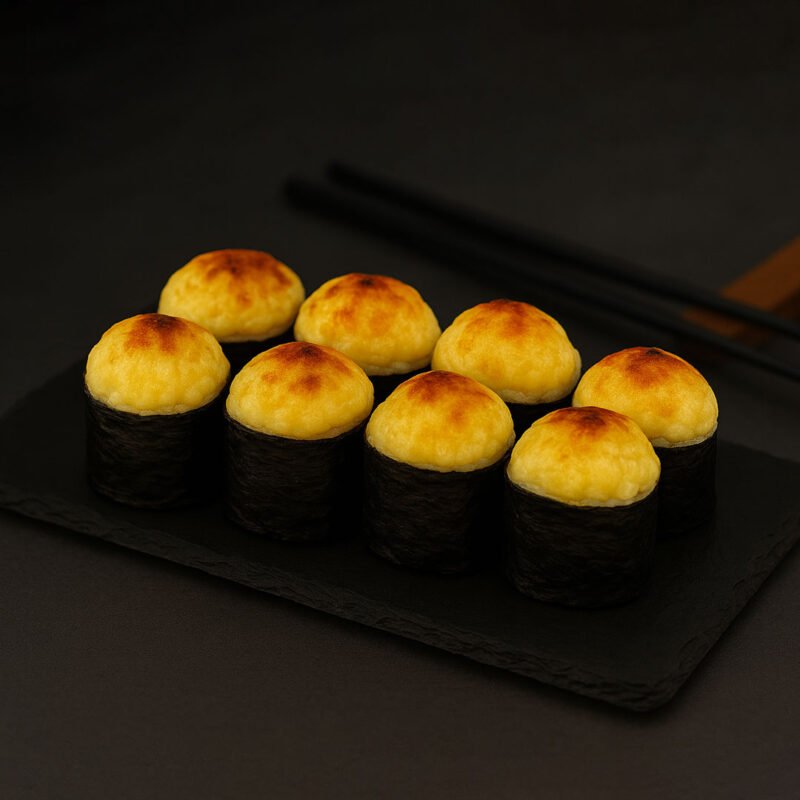 Rice, seaweed, cucumber, avocado, eel, cheese mix, mayonnaise, teriyaki sauce