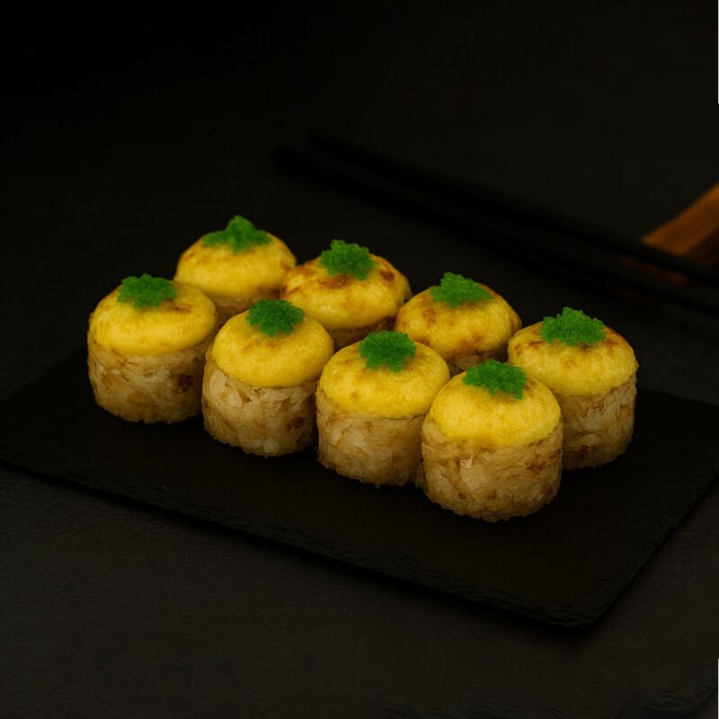 Rice, seaweed, cucumber, avocado, salmon, tuna flakes, cheese mix, mayonnaise, green masago, teriyaki sauce