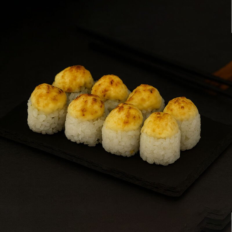 Rice, seaweed, cucumber, avocado, eel, cheese mix, mayonnaise, teriyaki sauce