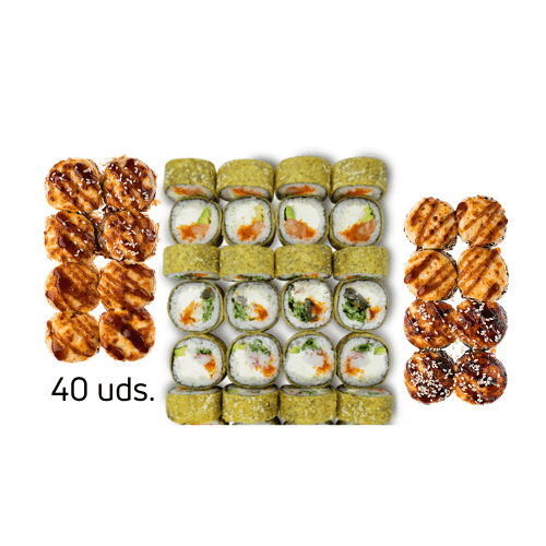 (8 pcs.) Yuki, (8 pcs.) Chicken hot maki, (8 pcs.) Unagi tempura, (8 pcs.) Fudzi tempura, (8 pcs.) Yakao tempura (40 pcs.)