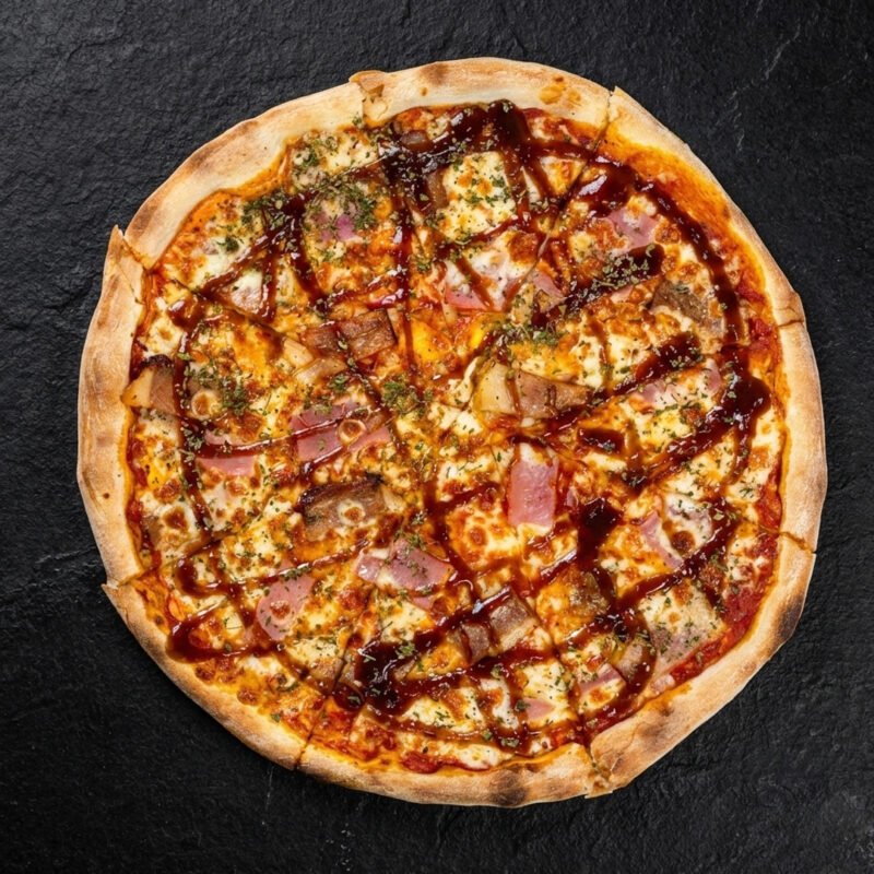 Tomato sauce, mozzarella, york ham, bacon, BBQ sauce