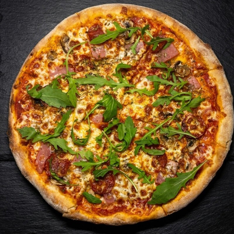 Tomato sauce, mozzarella, york ham, arugula, mushrooms