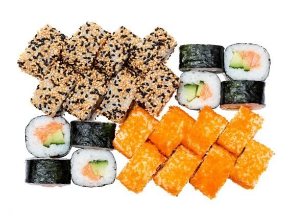 8 pcs. Kani maki, 8 pcs. Avocado maki V, 8 pcs. cream cheese, 8 pcs. Canada, 8 pcs. Karai maguro, 8 pcs. Ishido, 8 pcs. Hozon maguro (56 pcs.)