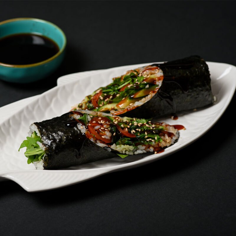 Rice, lettuce, cucumber, tobiko, sesame, teriyaki sauce