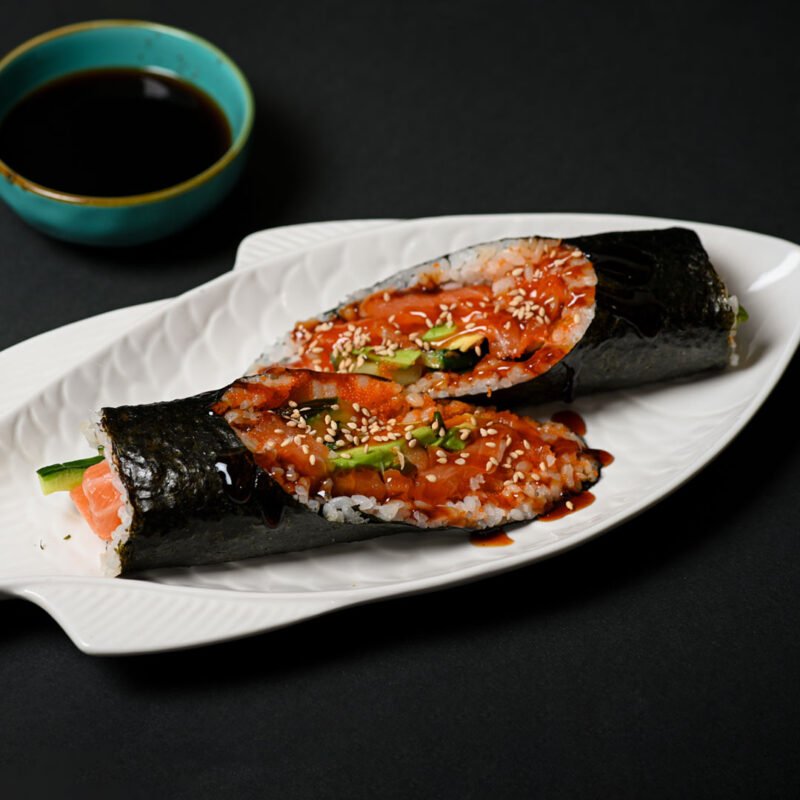 Rice, salmon, lettuce, cucumber, tobiko, sesame, teriyaki sauce