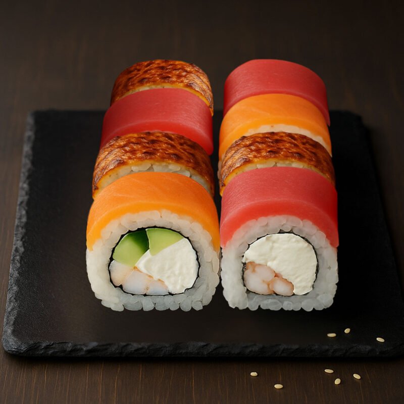 Rice, seaweed, cream cheese, eel, avocado, salmon, unagi sauce, red masago