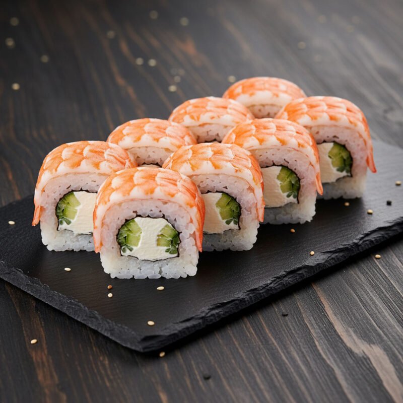 Rice, seaweed, cream cheese, cucumber, shrimp