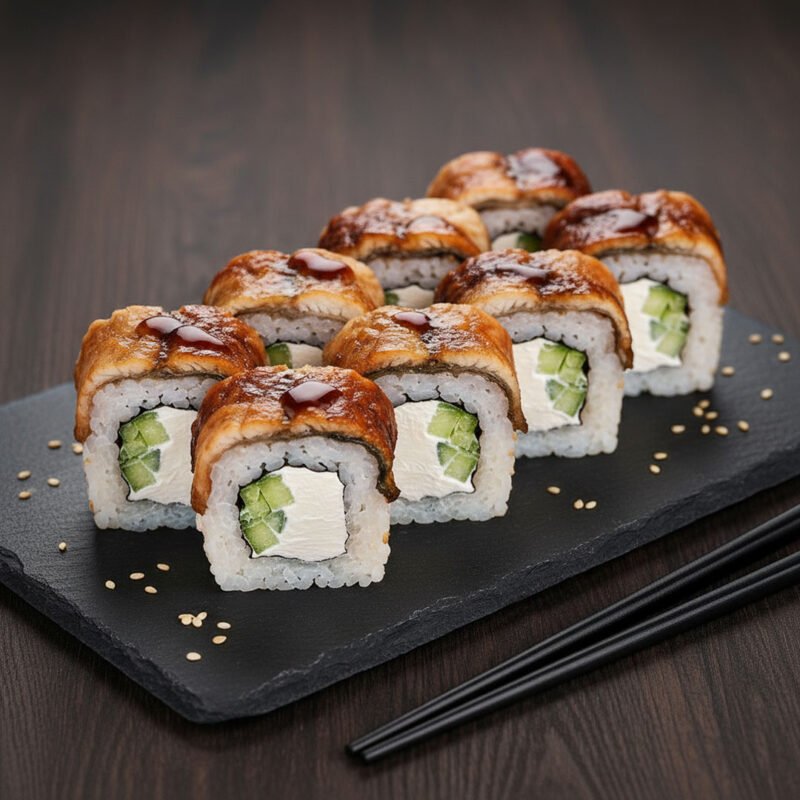 Rice, seaweed, cream cheese, cucumber, eel, unagi sauce, sesame