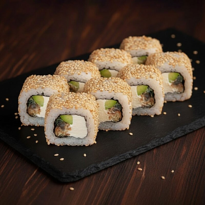 Rice, seaweed, cream cheese, avocado, eel, unagi sauce, sesame