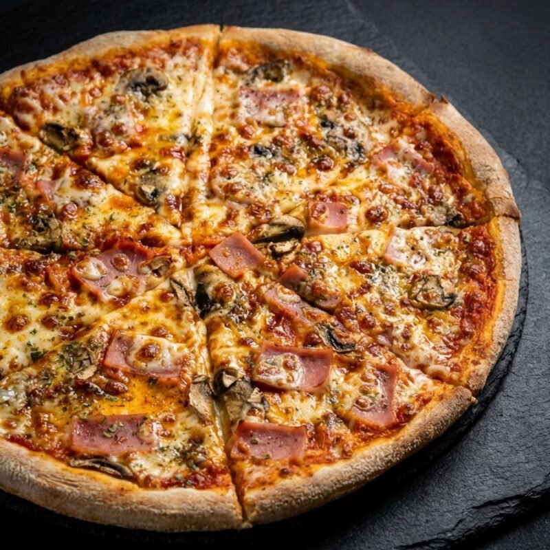 Salsa de tomate, mozzarella, jamón york, champiñones