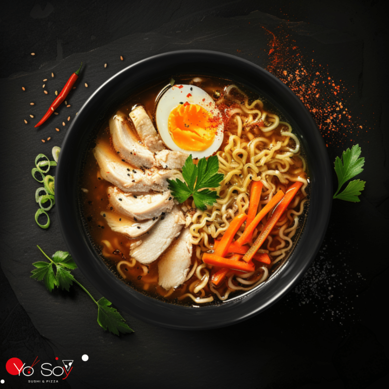 Ramen (fideos), filete de pollo, medio huevo, zanahoria, cebolla