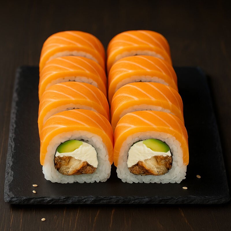 Arroz, alga, crema de queso, anguila, aguacate, salmón, salsa unagi, masago rojo
