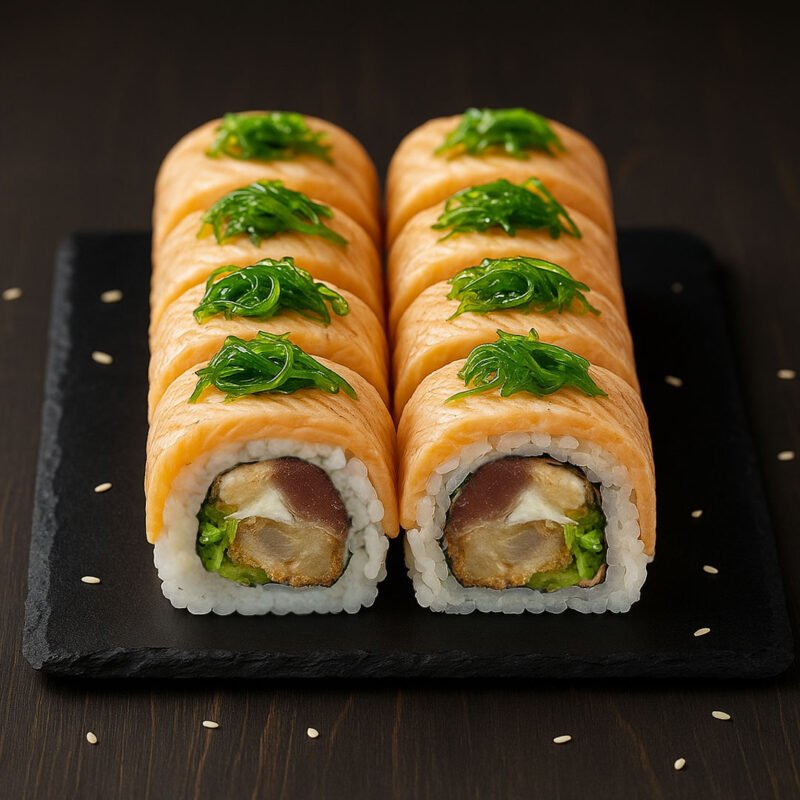 Arroz, alga, crema de queso, aguacate, salmón asado, masago verde