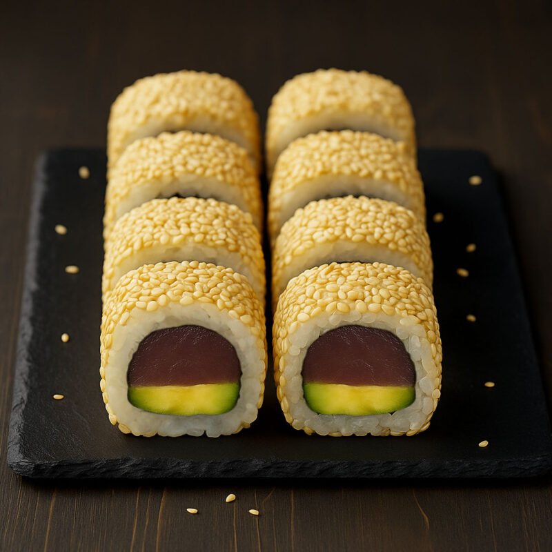 Arroz, alga, crema de queso, pepino, gamba, salmón, atún, anguila, salsa unagi, sésamo