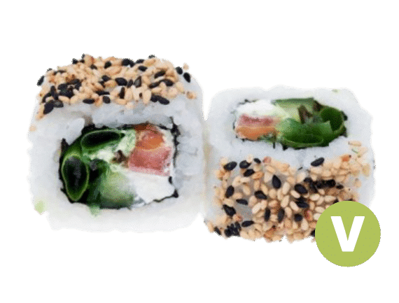 Salmon, aguacate, palitos de cangrejo, pepino, crema de queso, salsa unagi, semillas de sesamo (6 uds.)