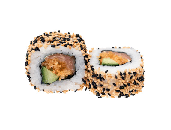 Salmon, aguacate, palitos de cangrejo, pepino, crema de queso, salsa unagi, semillas de sesamo (6 uds.)