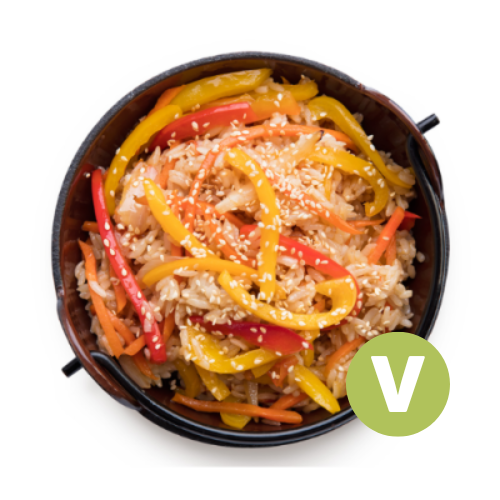 Fideos de arroz, pimiento verde, pimiento rojo, zanahoria, cebolla, sésamo, champiñones, salsa teriyaki