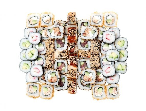 3 pcs. Sake нигири, 3 pcs. Maguro нигири, 3 pcs. Unagi нигири, 3 pcs. Ebi нигири, 3 pcs. Smoked лосось нигири, 2 pcs. Sake гункан , 2 pcs. Maguro гункан, 2 pcs. Unagi гункан, 3 pcs. масаго гункан, 4 pcs. Sake kappa маки, 4 pcs. Sake маки (32 pcs.)