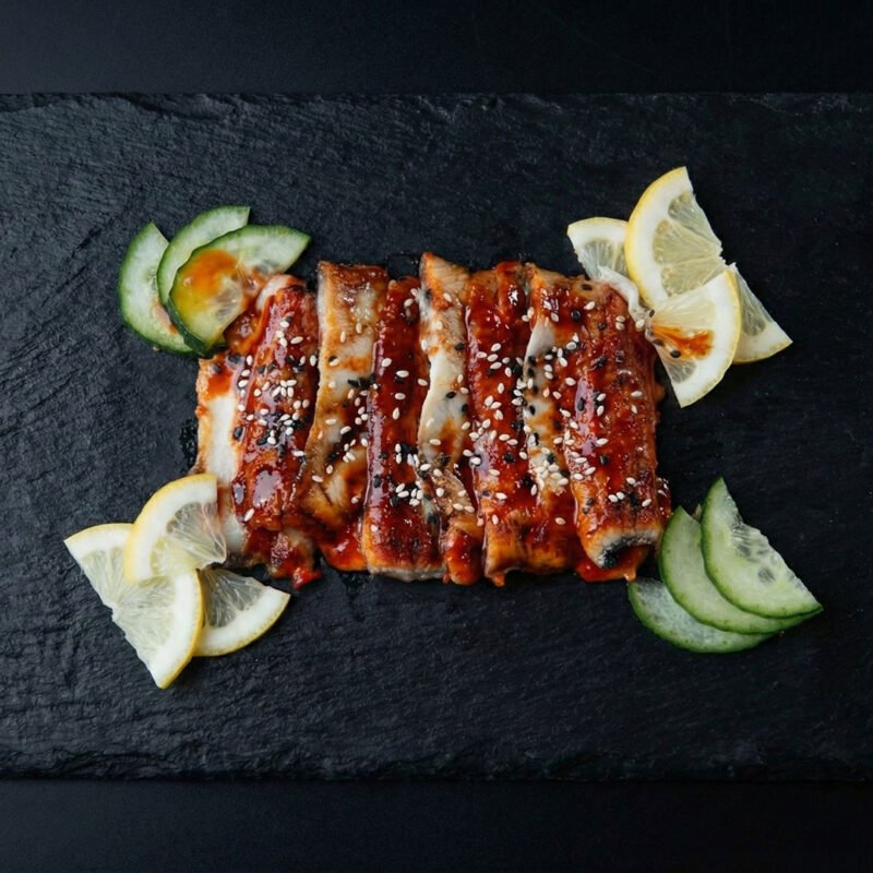 Угорь, соус унаги, кунжут, долька лимона, огурец