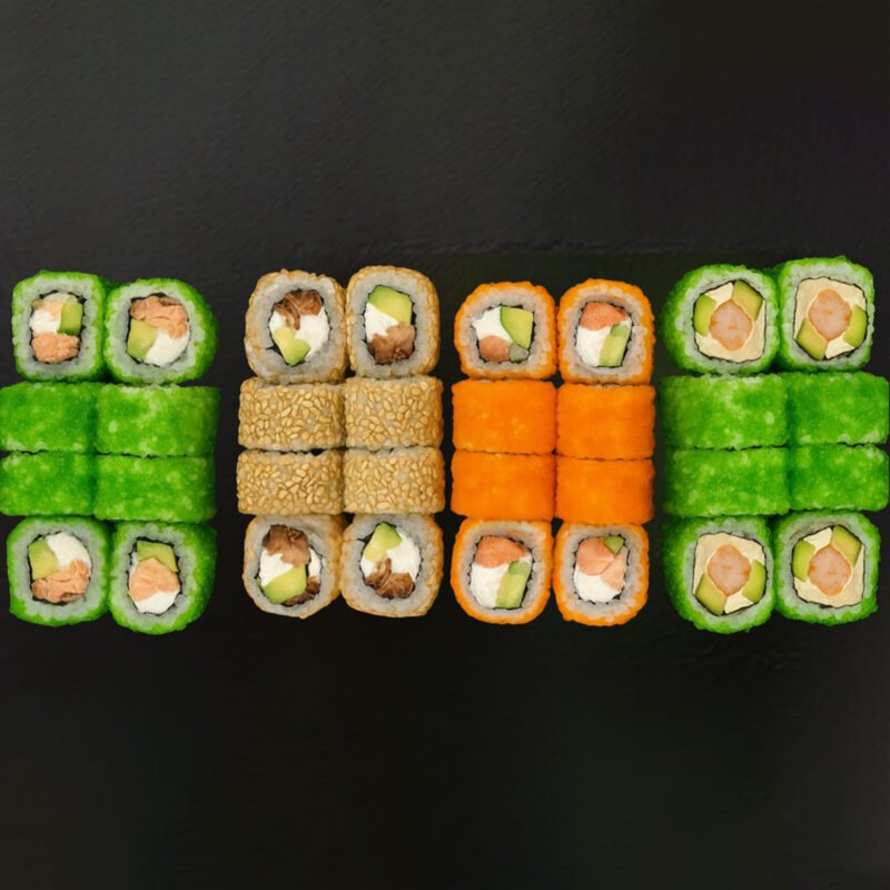 8 шт. Калифорния с Лососем, 8 шт. Калифорния с Жареным Лососем, 8 шт. Калифорния с Угрем, 8 шт. Калифорния с Креветками