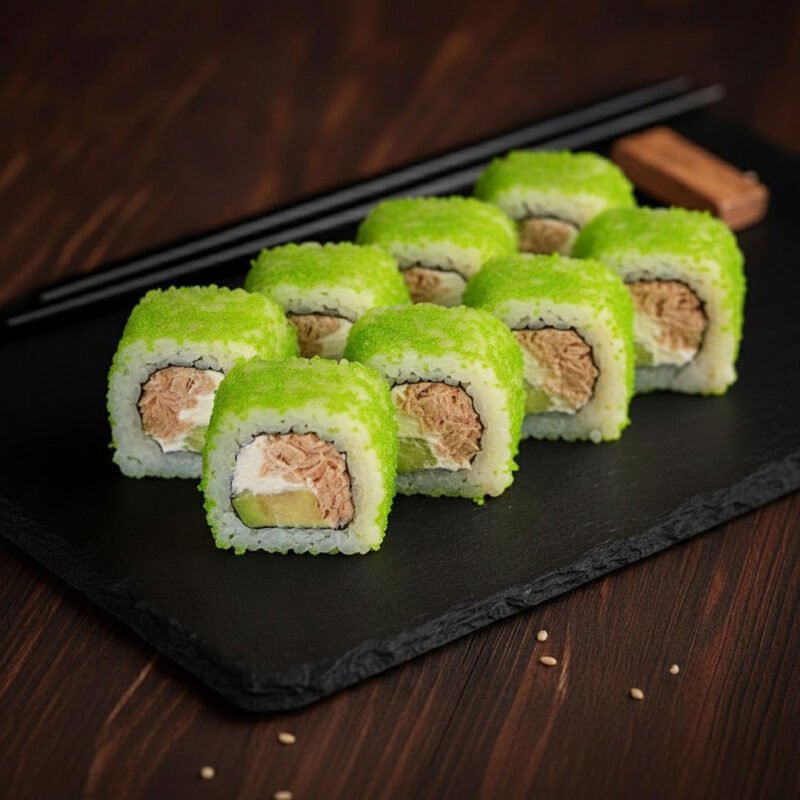 Рис, нори, сливочный сыр, авокадо, жареный лосось, икра масаго зеленая