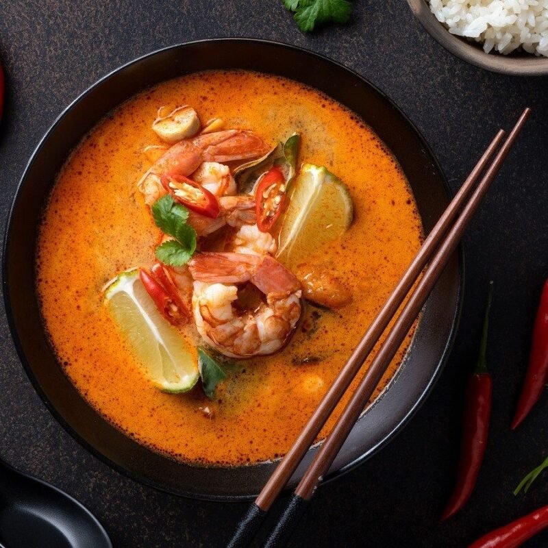 Бульйон із креветок, Креветки, Сік лайма, Тайський чилі, Паста, Рибний соус, Печериці