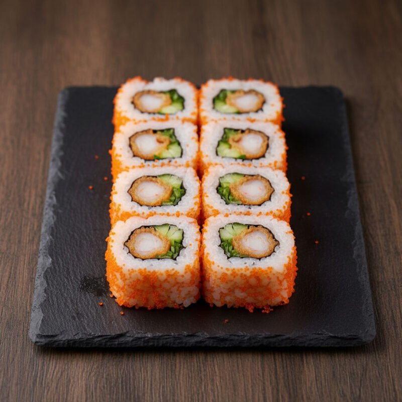 Рис, норі, майонез, огірок, креветка темпура, ікра масаго червона