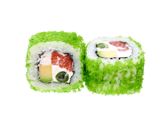 Тунець, лосось, авокадо, вершковий сир, camarones темпура, alga wakame, масаго naranja – verde і чорний, тобіко rojo (8 pcs.)