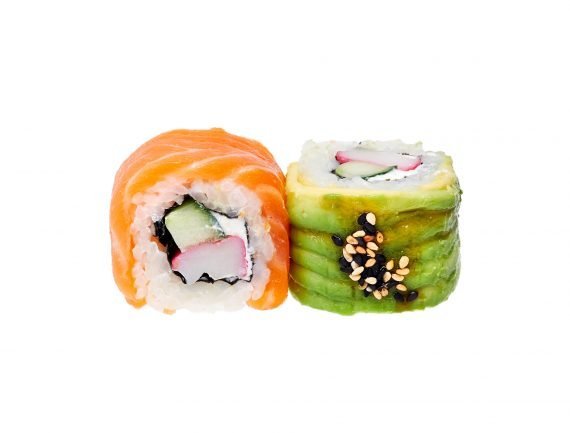 Лосось, тунець, crema з queso, огірок, tomates, pimiento rojo (6 pcs.)